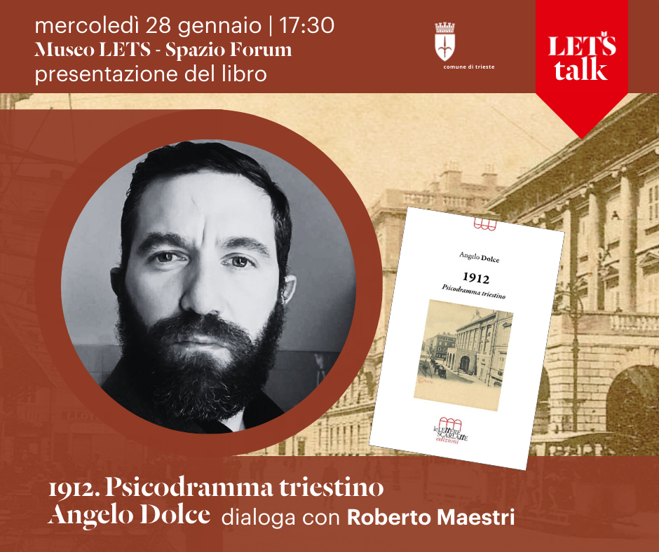 Mercoledì 28 gennaio alle ore 17.30 il Museo LETS – Letteratura Trieste ospita la presentazione del romanzo 1912. Psicodramma Triestino di Angelo Dolce, pubblicato da Le Lettere Scarlatte nel maggio 2025. Il volume è un’opera originale che intreccia letteratura, musica e psicanalisi in un’immersione profonda nella Trieste del primo Novecento.