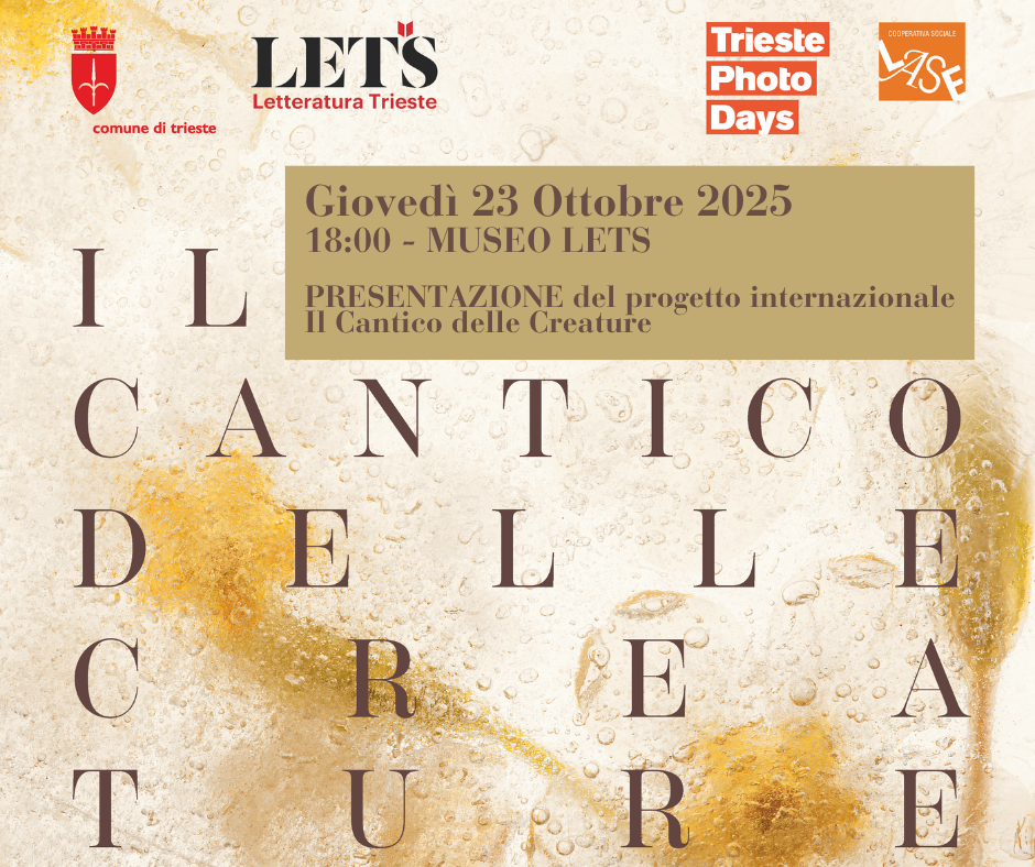 Trieste Photo Days in collaborazione con il Comune di Trieste, LETS-Letteratura Trieste e La.Se. Società Cooperativa Sociale presenta al Museo LETS Il Cantico delle Creature, un progetto fotografico internazionale, nato in occasione dell’ottavo centenario del Cantico di San Francesco d’Assisi, che ha invitato autori da tutto il mondo a raccontare, con le immagini, la bellezza e le virtù del creato insieme alle sue ferite causate dall’impatto umano.