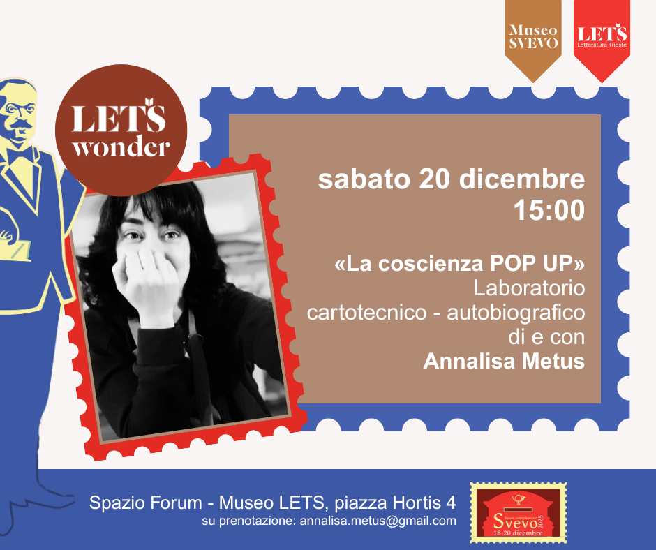“Pieghi, incolli, colori, vedrà come arriverà a vedersi intero!” Così il Dottor S. avrebbe motivato il suo paziente, Zeno Cosini, se invece di invitarlo a scrivere la sua biografia, l’avesse invitato a realizzarla con la tecnica del pop-up. Guidato dalla esperienza di Annalisa Metus e dalla propria creatività, ciascun partecipante costruirà il proprio diario d’artista usando diverse tecniche combinate assieme. Non sono richieste né particolari abilità manuali né una conoscenza approfondita del testo, ma aiuta averlo letto! Il laboratorio è rivolto ad un pubblico adulto (+18) e avrà una durata di 120 minuti.