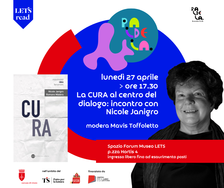 Lunedì 27 aprile, dalle ore 17.30 alle 19.00, presso lo Spazio Forum di Museo LETS di Trieste, il laboratorio di lettura condivisa PAIDEIA ospita un incontro dedicato al tema della Cura, a partire dall’omonimo saggio scritto a quattro mani da Nicole Janigro e Romano Màdera (Editrice Bibliografica, 2023).